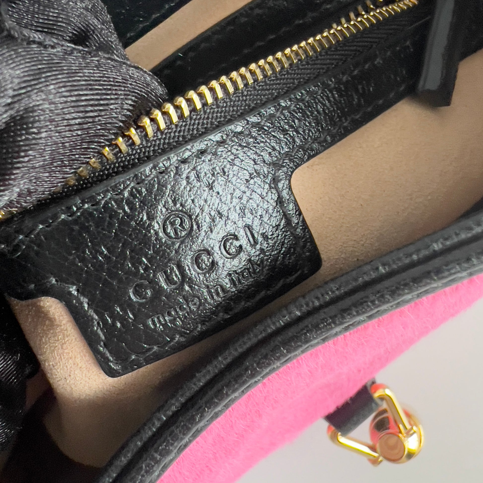 This is an authentic GUCCI Calf Hair Textured Dollar Calfskin small Jackie 1961 Hobo in Pink and Black. This classic hobo is finely crafted of black calfskin leather and pink calf hair. The bag features a stylish looping leather shoulder strap, and a polished gold piston lock. This opens to a beige suede interior with a zipper pockets.