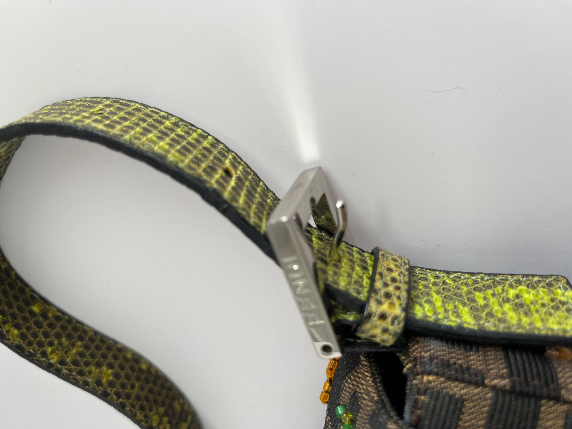 This is one of the most iconic Fendi Baguette styles, reissued for the brand’s 15th anniversary in denim, which stayed almost entirely true to the original design with only slight adjustments. In the vintage editions, this motif appeared across different materials — from snakeskin and fur to denim and, of course, the most classic zucca canvas. This particular piece features the embroidery on zucca, paired with green lizard skin accents and a green enamel buckle, giving the bag a lively and playful touch. It remains one of the most popular and accessible entry-level Fendi Baguettes for collectors.