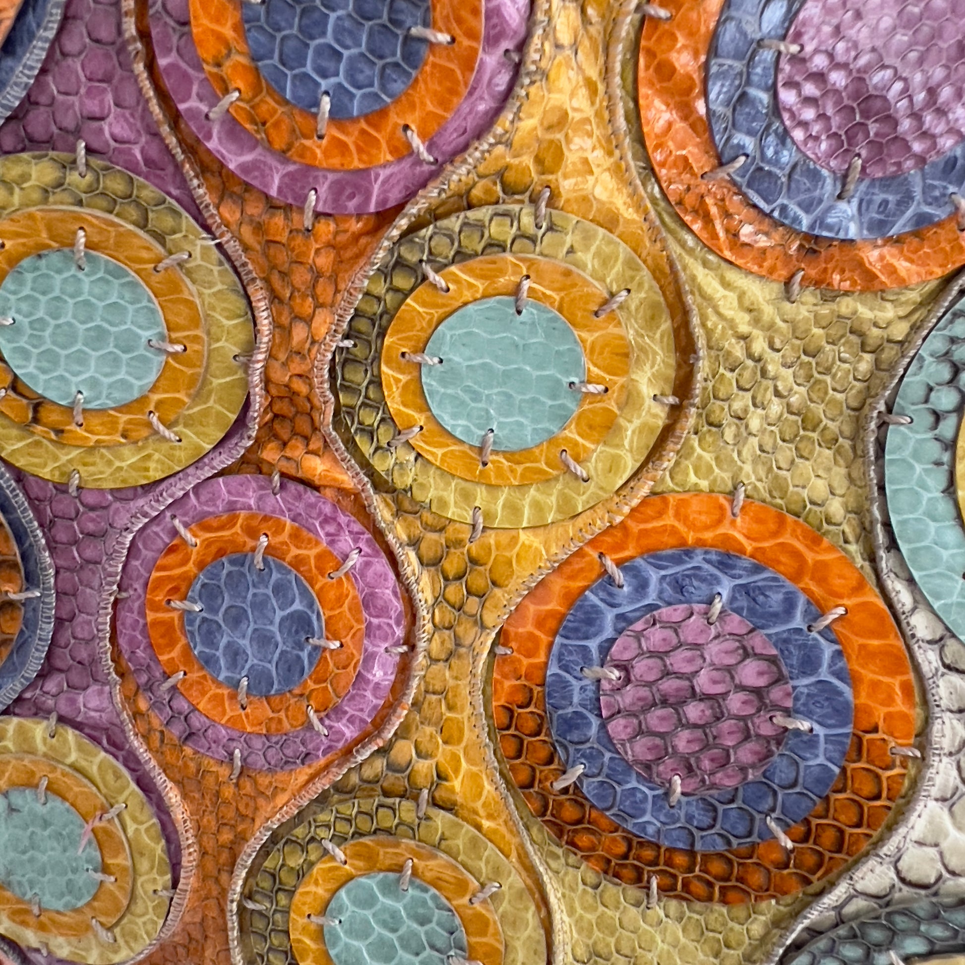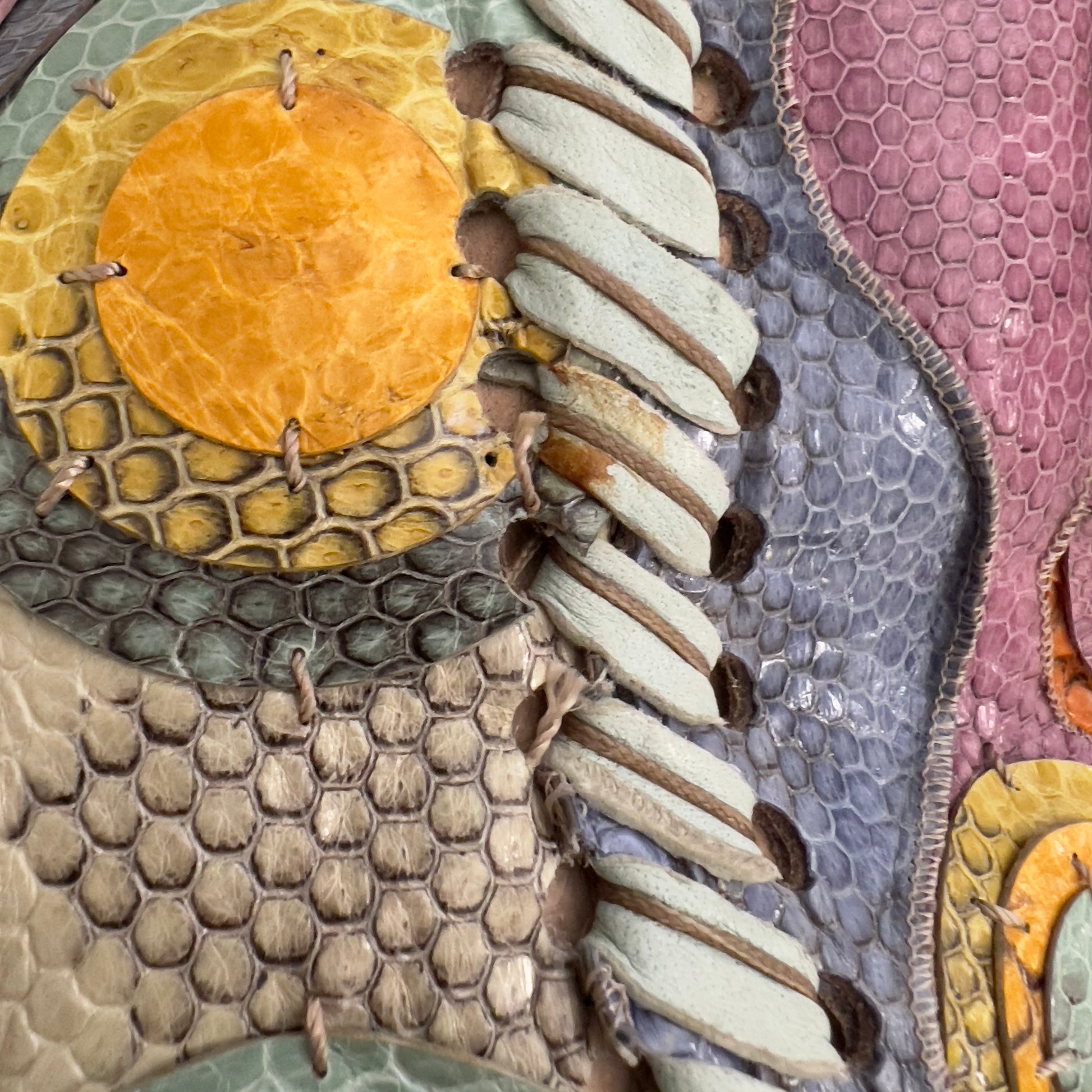 This is a very cool short-trip bag and also the largest size in the Baguette line. The body is made from a patchwork of colorful snakeskins, with a suede interior. The strap is detachable, so it can also be carried as an oversized clutch. The colorful polka dots add a playful, making it truly one of a kind.
