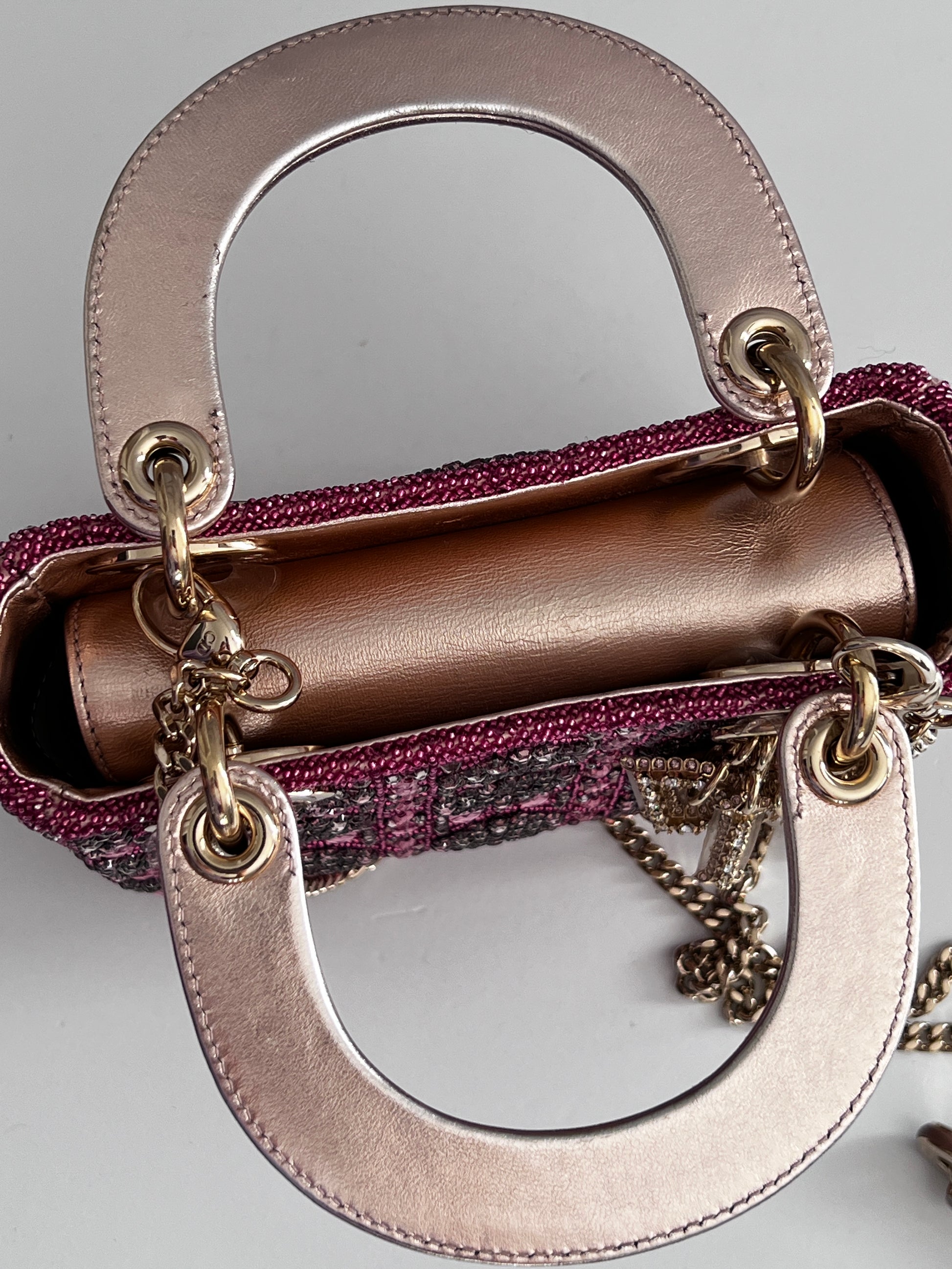 Pre-loved Mini Lady Dior Bag Metallic Lambskin and Rose des Vents Satin Embroidered with Beads