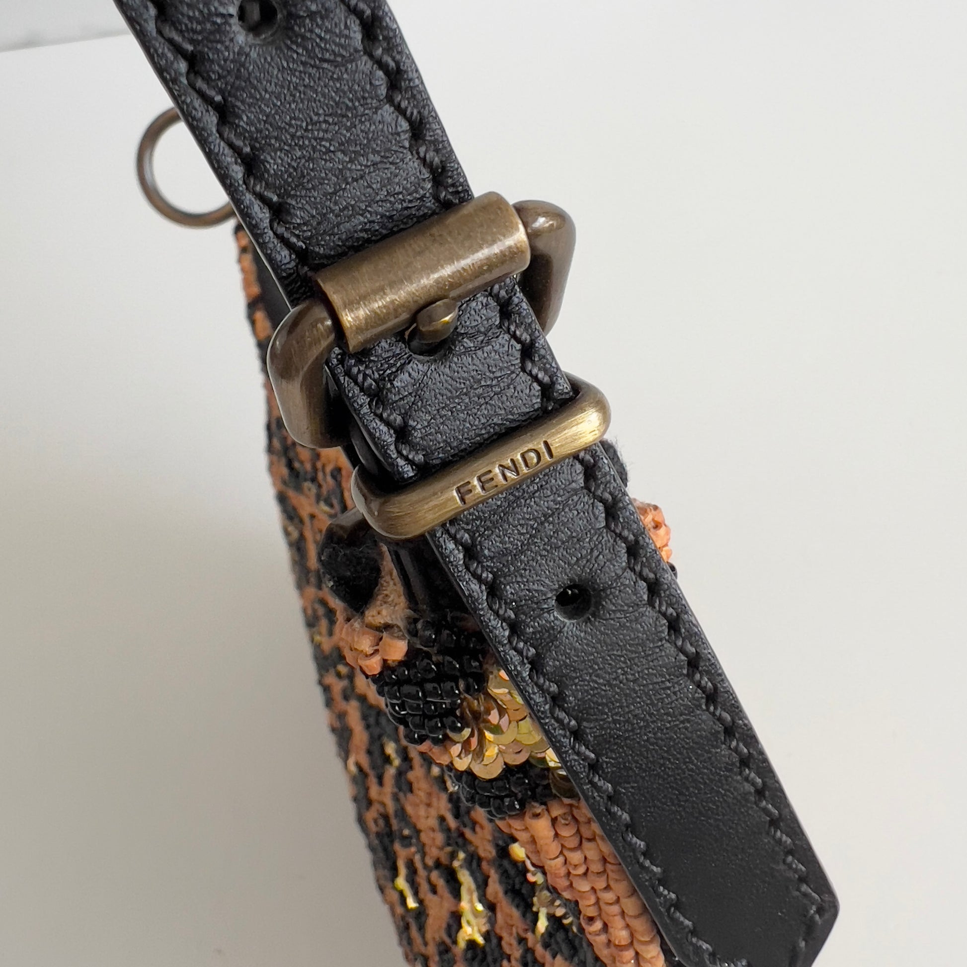 This is another iconic Fendi style — the Oyster. Although it’s not as popular as the Baguette, the Oyster line includes some truly unique designs, like this one featuring wooden beads and gold sequins embroidered into a leopard pattern. It has enough capacity for daily use and is such a special little bag.