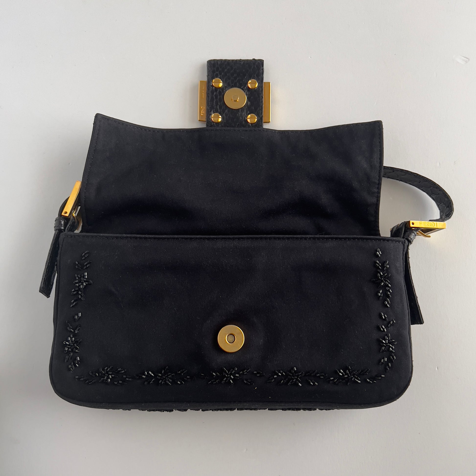 Vintage Fendi Black Embroidered Beads Cloth Baguette