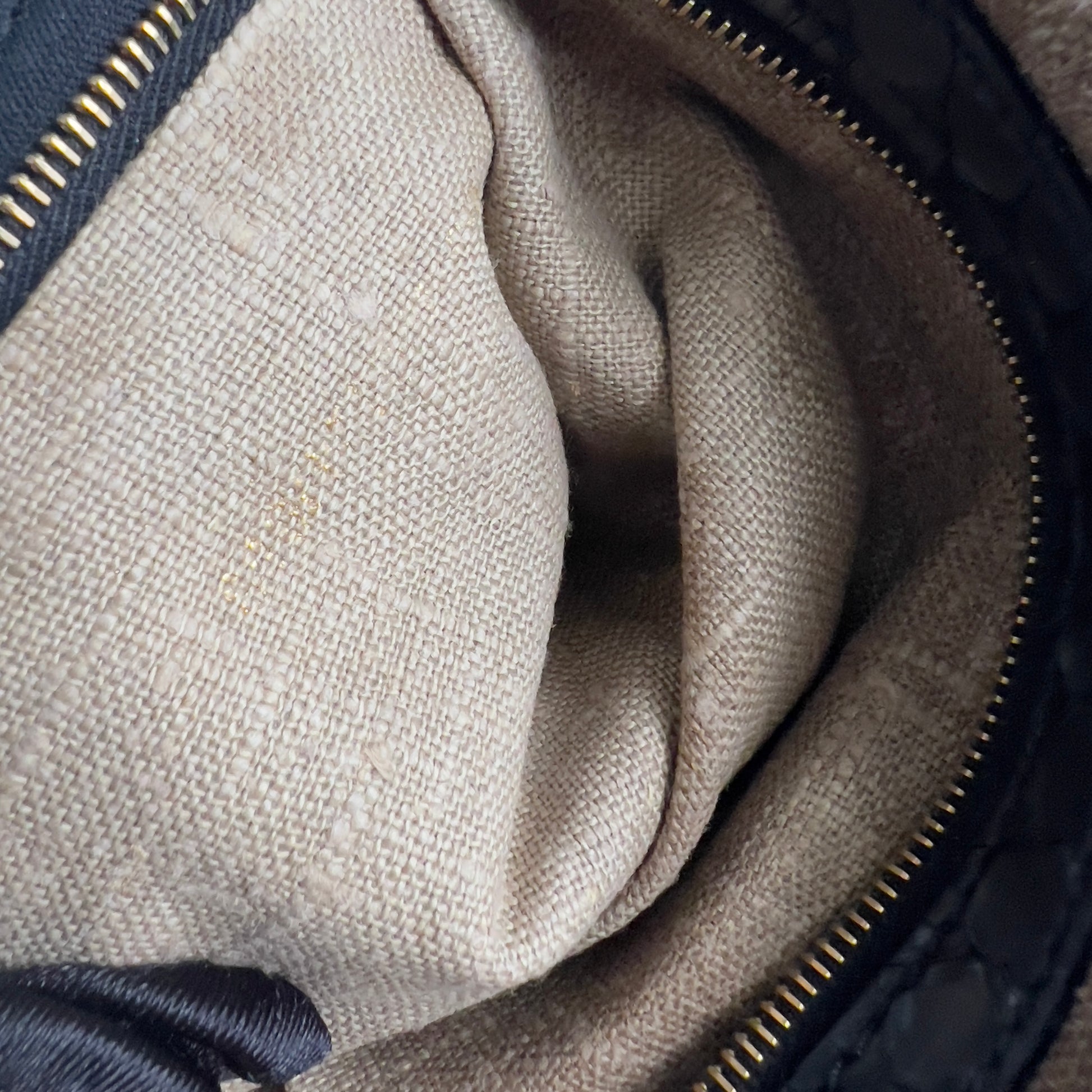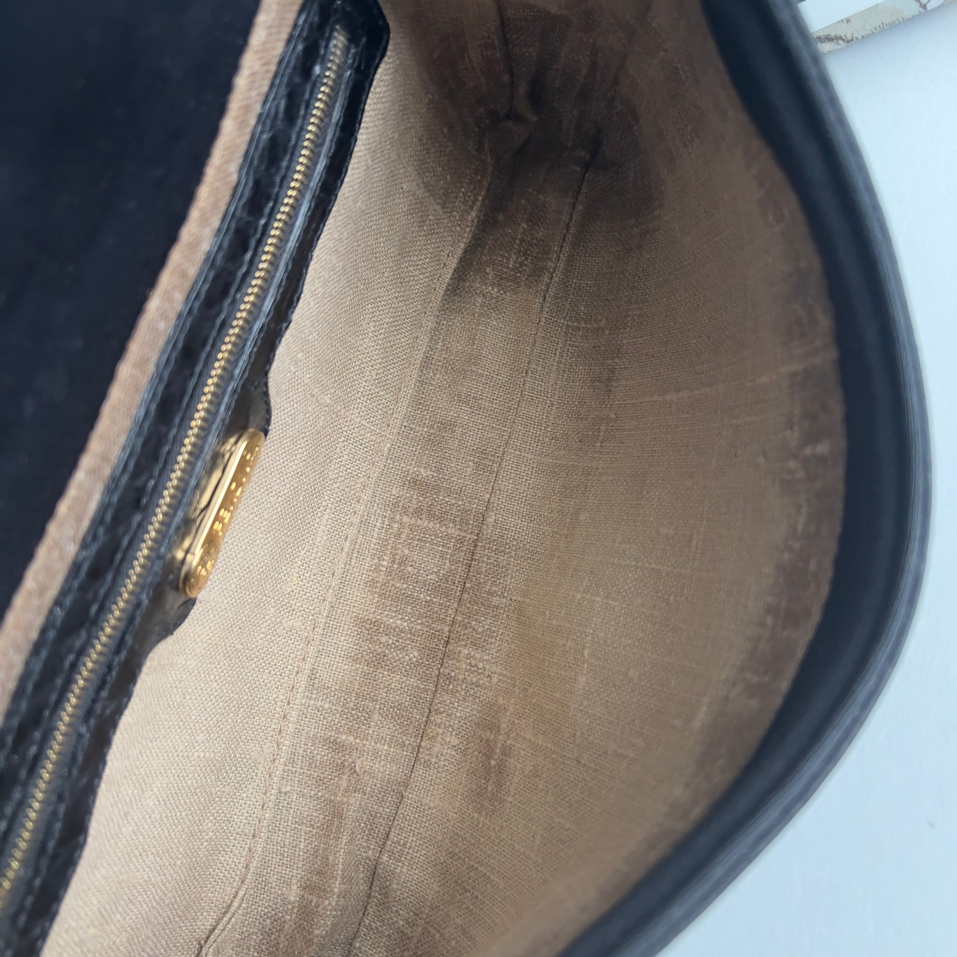 Linen lining, python skin strap. Fabric body.