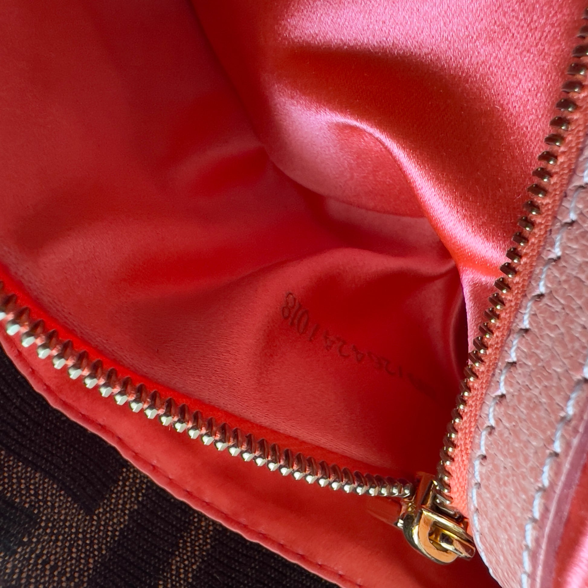 Fendi is so good at adding fresh design elements to their classic Zucca bags. This one features a different leather trim and a beautiful enamel flower on the buckle as the finishing touch.