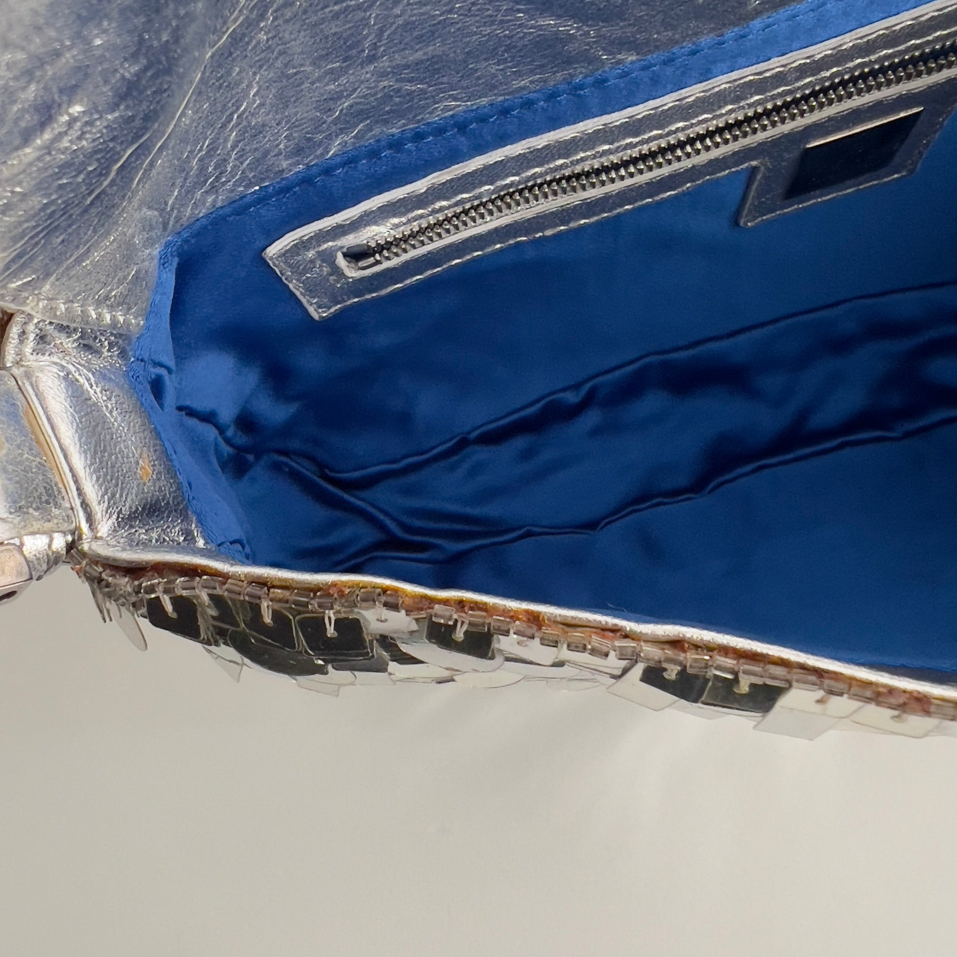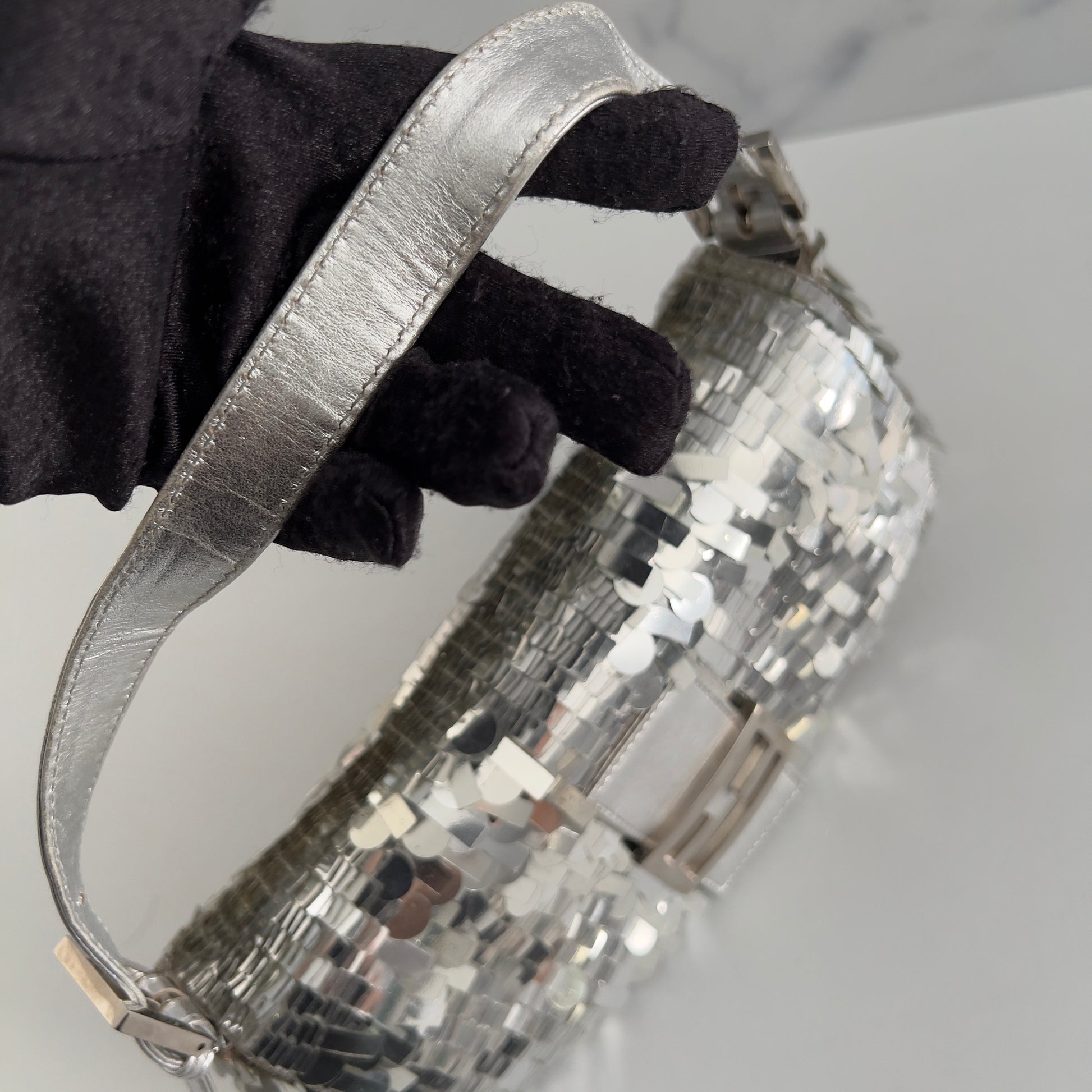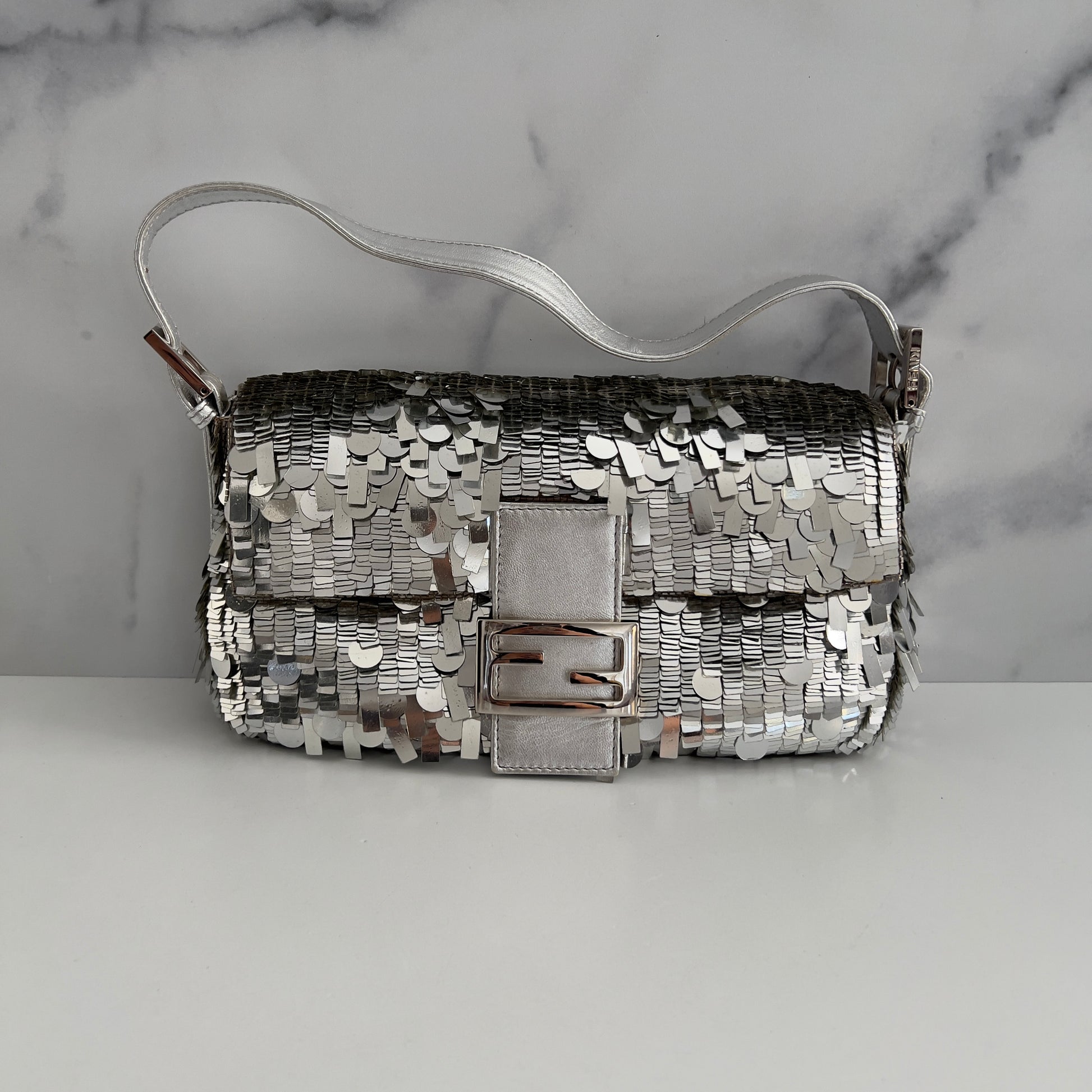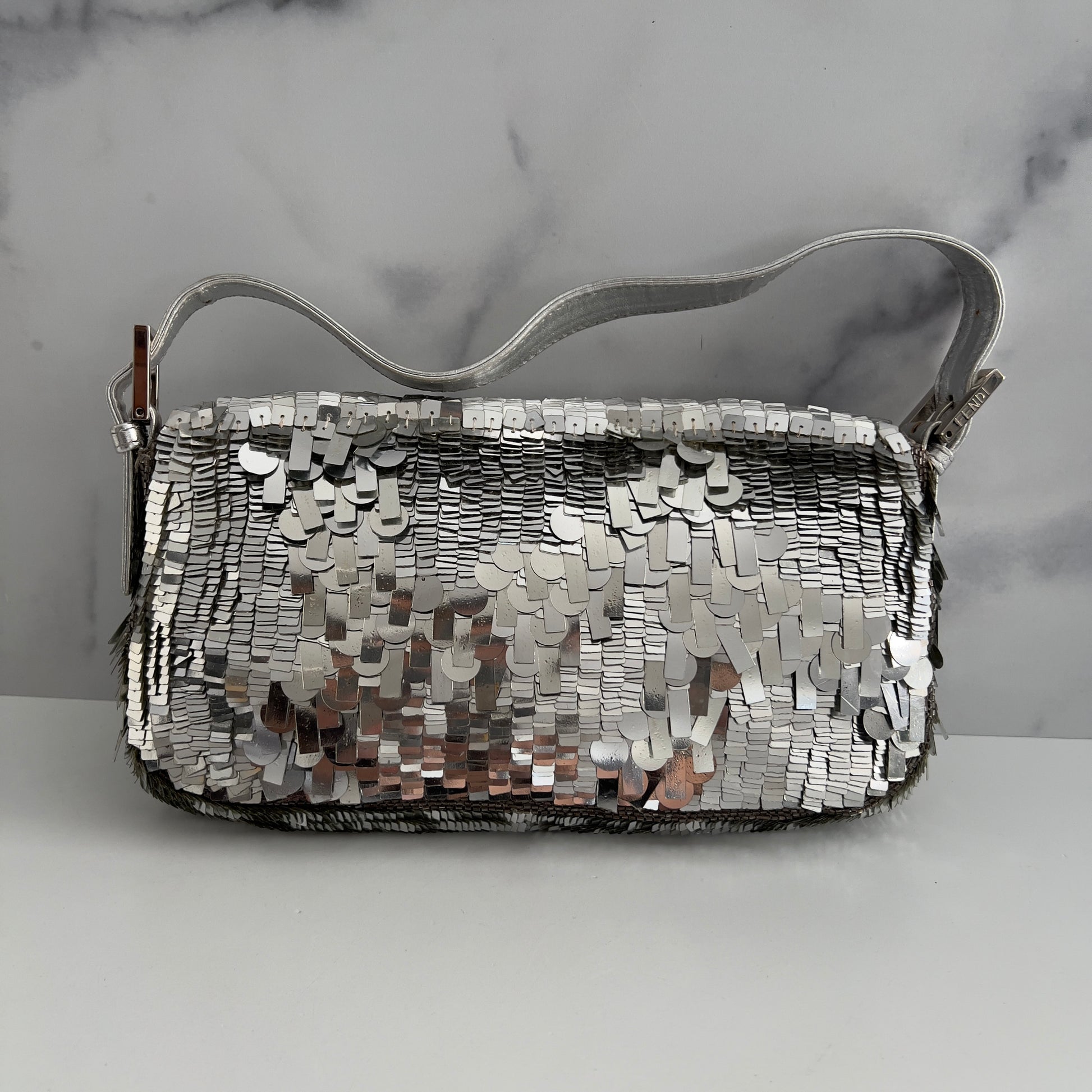 This is Fendi’s iconic silver sequin Baguette — a timeless classic that has remained highly coveted for 25 years since it’s released. Ultra rare piece.